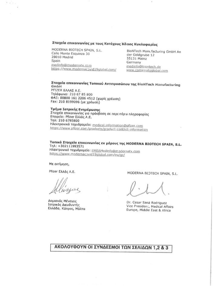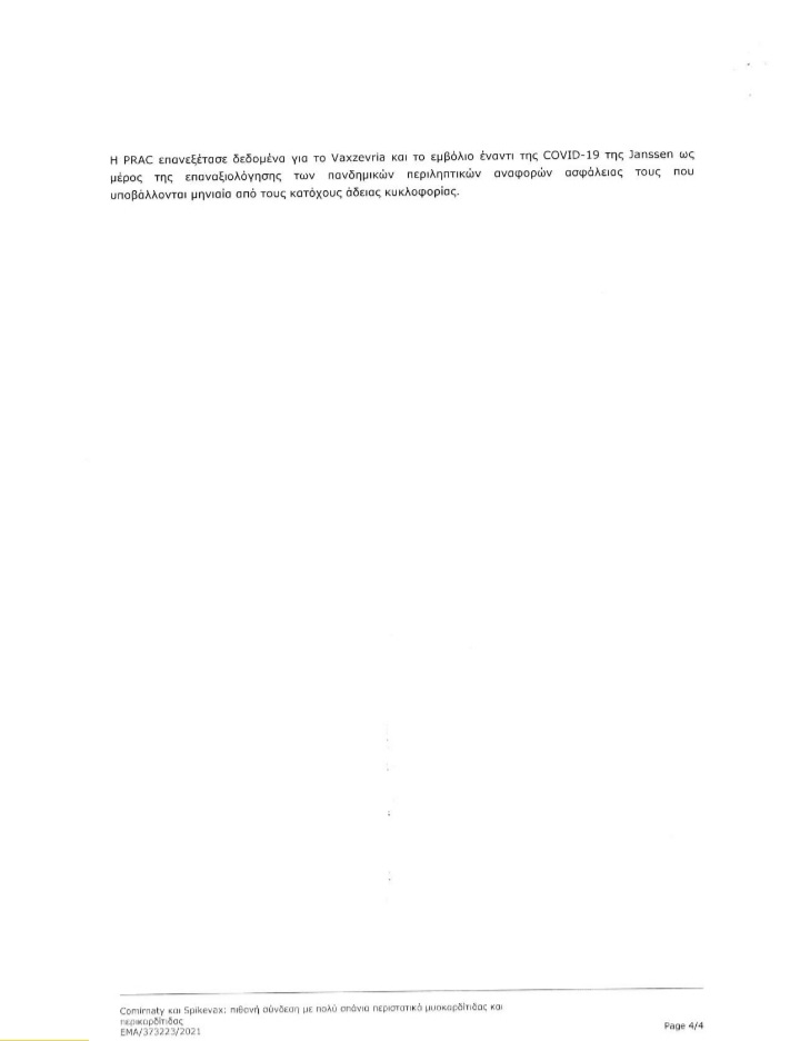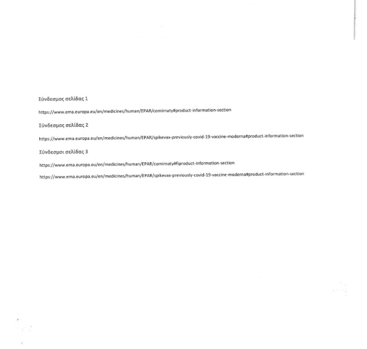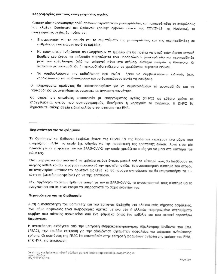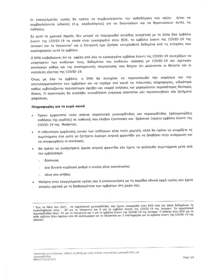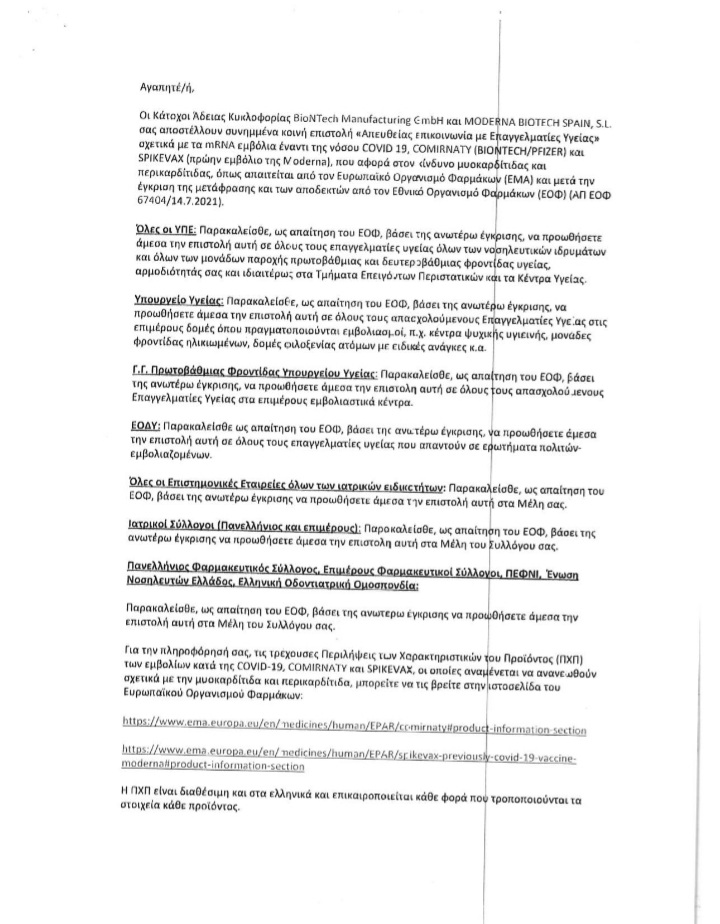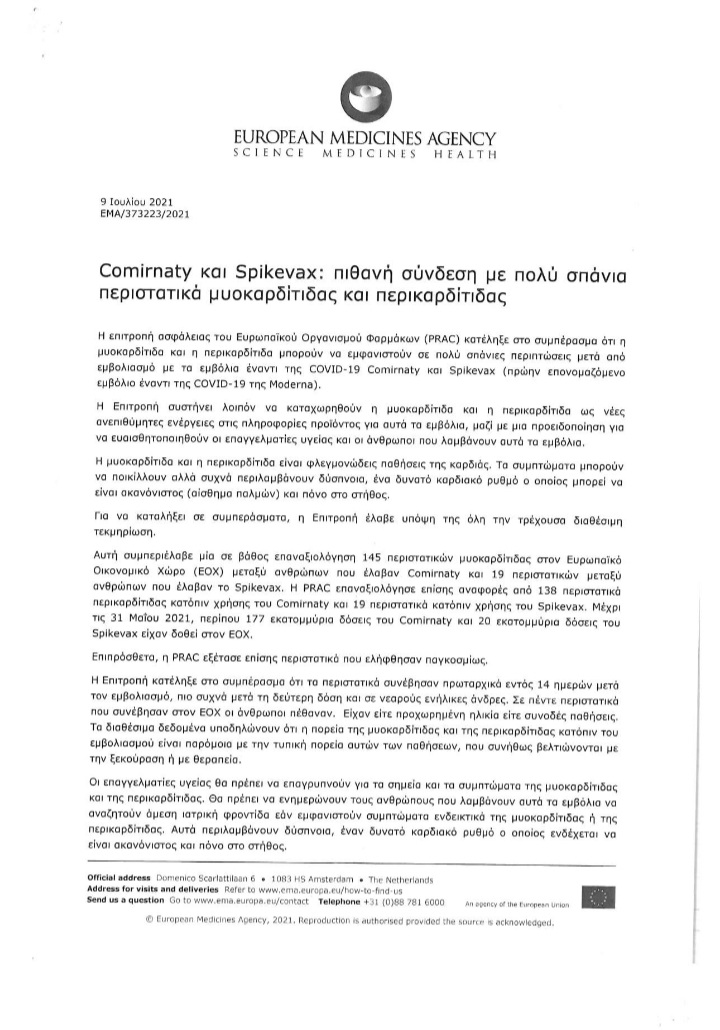 Συνημμένο έγγραφο 1: Tης Ευρωπαϊκής Ένωσης προς τις ιατρικές δομές της χώρας για προβλήματα που εμφανίστηκαν στους εμβολιασμένους –μυοκαρδίτιδα και περικαρδίτιδα– τα οποία χρήζουν άμεσης παρέμβασης από ιατρό-ειδικό καρδιολόγο.