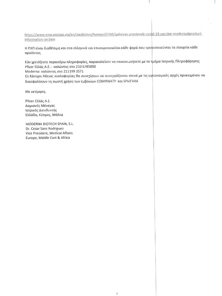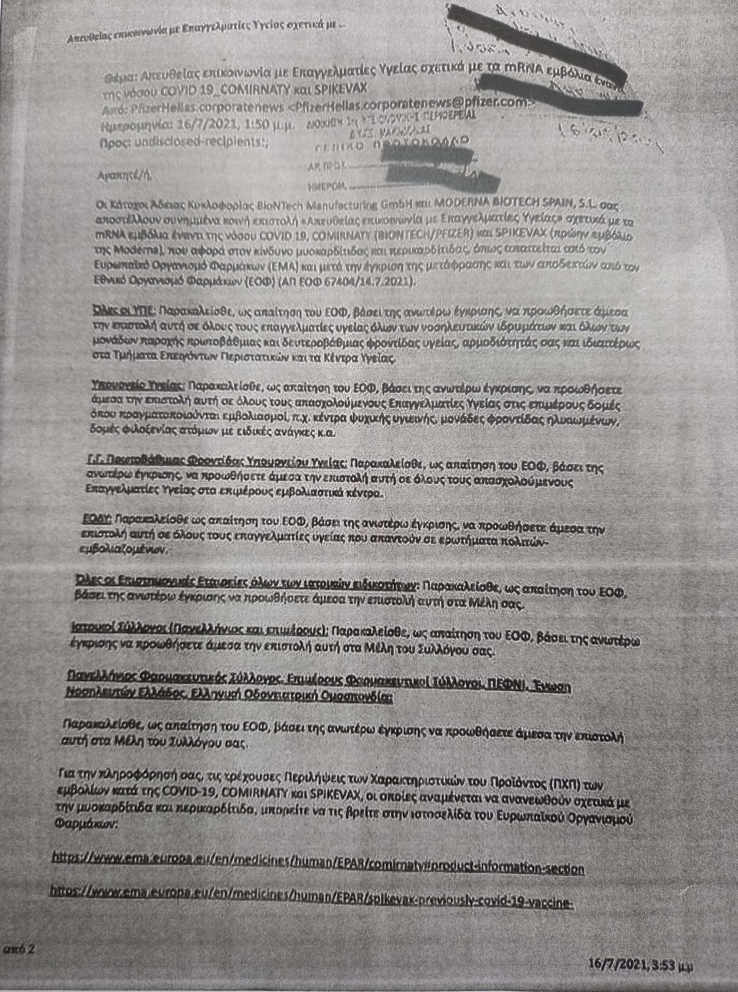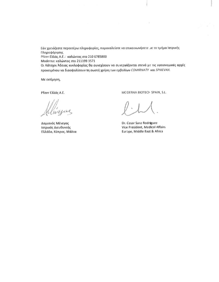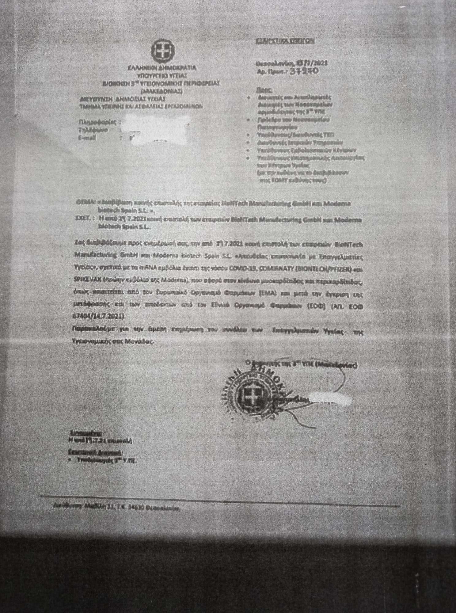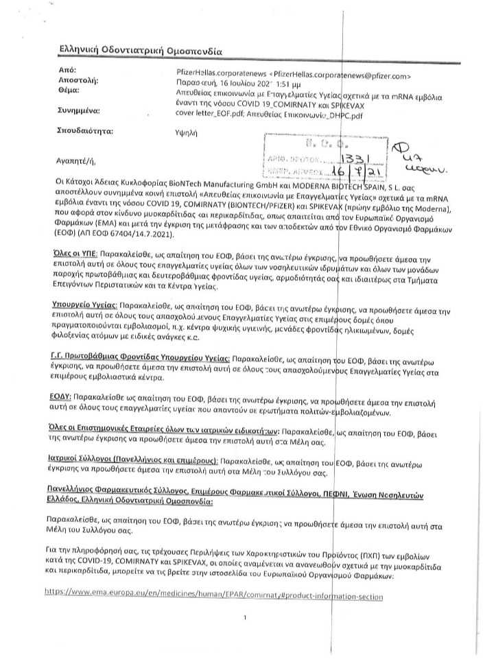 Συνημμένο έγγραφο 1: Tης Ευρωπαϊκής Ένωσης προς τις ιατρικές δομές της χώρας για προβλήματα που εμφανίστηκαν στους εμβολιασμένους –μυοκαρδίτιδα και περικαρδίτιδα– τα οποία χρήζουν άμεσης παρέμβασης από ιατρό-ειδικό καρδιολόγο.