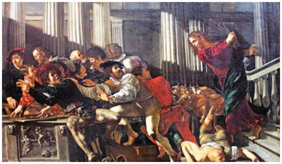 «Και ποιήσας φραγγέλιον εκ σχοινίων πάντας εξέβαλε εκ του ιερού […] και των κολλυβιτών εξέχεε το κέρμα και τας τραπέζας ανέτρεψε.  Μη ποιείτε τον οίκον του Πατρός μου οίκον εμπορίου». (Ιωάννης β΄ 15-16)