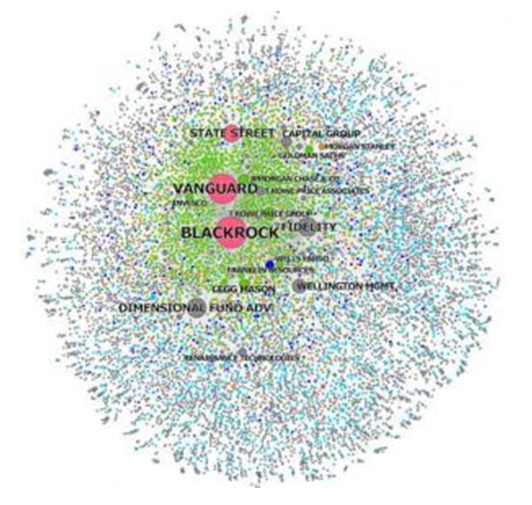 Όπως φαίνεται στο γράφημα του δικτύου ιδιοκτησίας της BlackRock και της Vanguard παρακάτω, που περιλαμβάνεται σε άρθρο του 2017 «οι τρεις εταιρίες BlackRock, Vanguard και State Street κατέχουν εταιρική Αμερική» (βλ. The Conversation)