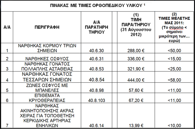 1. Τον Απρίλιο του 2011 ανακοινώθηκαν, στο πλαίσιο μιας έρευνας, οι τιμές ενός αριθμού 16 προϊόντων ορθοπεδικού υλικού. Η μελέτη συνεχίσθηκε και επεκτάθηκε και σε άλλα ορθοπεδικά προϊόντα. Μέσα σε 1,5 περίπου χρόνο(!!!) από τότε, κάποιες τιμές του Παρατηρητηρίου αισίως μειώθηκαν. Οι νέες τιμές δε διαφέρουν από εκείνες της μελέτης, που προτάθηκαν τότε όπως και λίγο αργότερα για άλλα ορθοπεδικά προϊόντα, γεγονός που δείχνει την εγκυρότητα των αποτελεσμάτων της έρευνας. Οι τιμές όμως σε 7 προϊόντα –ευρείας χρήσης– του δείγματος της μελέτης των 28 προϊόντων παραμένουν ιδιαίτερα υψηλές.
