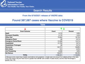 Τα στοιχεία που δημοσιεύθηκαν σήμερα (25 Ιουνίου 2021) δείχνουν ότι μεταξύ 14 Δεκεμβρίου 2020 και 18 Ιουνίου 2021, στο VAERS αναφέρθηκαν συνολικά 387.087 παρενέργειες, στις οποίες συμπεριλαμβάνονται 6.113 θάνατοι (αυξημένοι κατά 120 σε σχέση με τους θανάτους που αναφέρθηκαν την προηγούμενη εβδομάδα), και 31.240 σοβαρές βλάβες επικίνδυνες για τη ζωή (αυξημένες 1.369 σε σύγκριση με την προηγούμενη εβδομάδα).