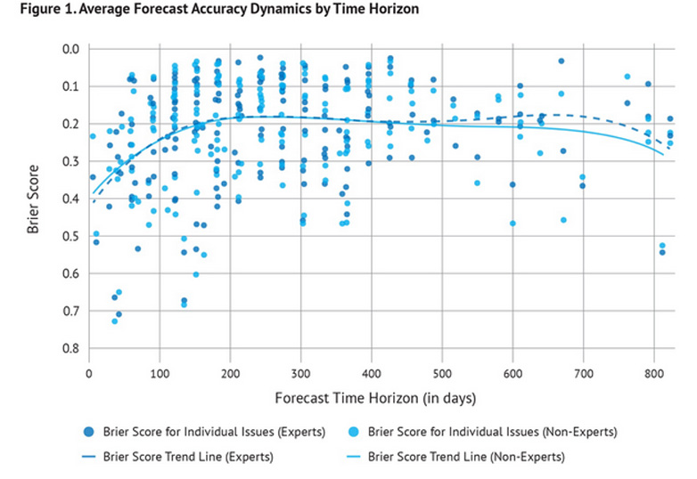 Όταν η ανάλυση γίνεται με βάση τον χρονικό ορίζοντα (βλ. Σχήμα 1), διαπιστώνεται ότι σε σύντομους ορίζοντες (έως ένα έτος) δεν υπάρχει ουσιαστική διαφορά στην ποιότητα των προβλέψεων. Η διαφορά εμφανίζεται κατά τις προβλέψεις σε μεγαλύτερα χρονικά διαστήματα, αλλά τότε τα διαθέσιμα δεδομένα είναι σημαντικά λιγότερα, καθιστώντας τα αποτελέσματα λιγότερο αξιόπιστα. Σε εξαιρετικά βραχείς ορίζοντες (εντός ενός τριμήνου), οι μη ειδικοί είναι κατά μέσο όρο ακόμη πιο ακριβείς από τους εμπειρογνώμονες, αλλά και σε αυτή την περίπτωση η έλλειψη παρατηρήσεων μπορεί να αποτελεί παράγοντα.