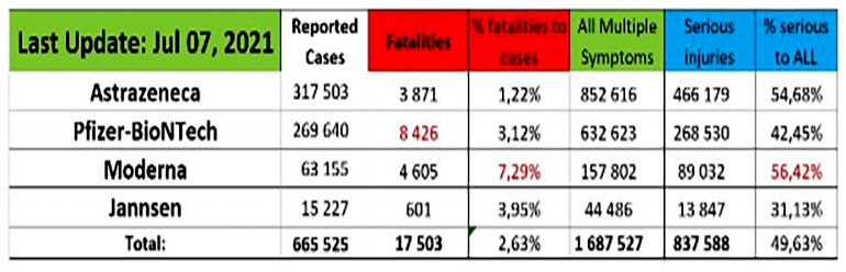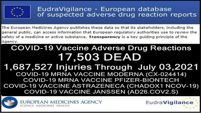 Η βάση δεδομένων EudraVigilanceδημοσιοποίησε ότι έως τις 3 Ιουλίου 2021 αναφέρθηκαν 17.503 θάνατοι και 1.687.527 παρενέργειες από τα 4 πειραματικά «εμβόλια» για την COVID-19: