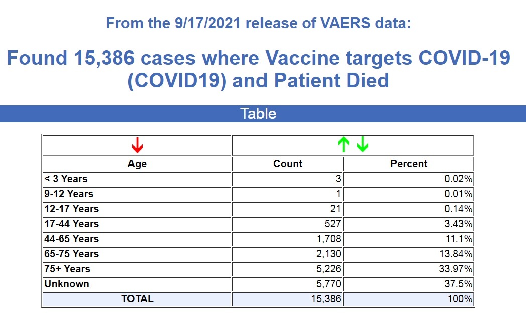 Παρατίθεται η κατανομή κατά ηλικία σύμφωνα με στατιστικά στοιχεία στη βάση δεδομένων της κυβέρνησης VAERS (που ενημερώθηκε στις 24/9/2021), από την οποία καθίσταται προφανές ότι οι συντριπτικά περισσότεροι θάνατοι μετά από «εμβόλια»-COVID συμβαίνουν σε άτομα άνω των 65 ετών. (Πηγή)