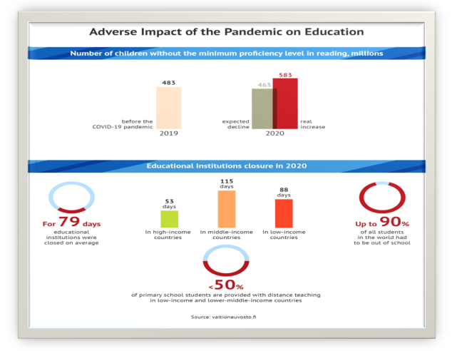 Τα χτυπήματα τα οποία υπέστη η παγκόσμια εκπαίδευση δεν ήταν λιγότερο αξεπέραστα. Επηρέασαν κατά κύριο λόγο τη νεότερη γενιά παγκοσμίως –σύμφωνα με την UNESCO, “περισσότεροι από 1.5 δισεκατομμύρια μαθητές και νέοι σε όλο τον πλανήτη έχουν επηρεαστεί από το κλείσιμο των σχολείων και των πανεπιστημίων λόγω της πανδημίας του Covid-19”. Στην κορυφή αυτών των δυσμενών συνεπειών που αφορούν τη νέα γενιά (βλέπε Box 1), υπάρχει επίσης το ευρύ «εκπαιδευτικό κενό», δηλαδή μία παγκόσμια έλλειψη άρτια εκπαιδευμένων εκπαιδευτικών. Σύμφωνα με το Ινστιτούτο Στατιστικής της UNESCO(UNESCO Institute for Statistics (UIS), «69 εκατομμύρια εκπαιδευτικοί πρέπει να στρατολογηθούν για να επιτευχθεί η παγκόσμια πρωτοβάθμια και δευτεροβάθμια εκπαίδευση μέχρι το 2023».