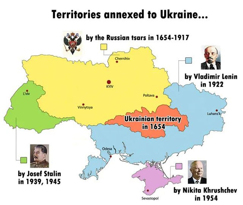 Η Ουκρανία είναι χαρακτηριστικό παράδειγμα κράτους που δημιουργήθηκε από «συγκολλήσεις» εδαφών. Μέχρι το 1654 είχε περίπου 10 φορές μικρότερη έκταση και περιοριζόταν ανατολικά και δυτικά του ποταμού Δνείπερου. Μέχρι το 1917 επί Τσαρικής Αυτοκρατορίας επεκτάθηκε στα βόρεια και δυτικά με προσαρτήσεις εδαφών που την πενταπλασίασαν για να έχει στρατηγικό βάθος να αντιμετωπίζει δυτικές επιδρομές. Το 1922 ο Λένιν την επέκτεινε ανατολικά και νότια μέχρι και την Οδησσό, το 1939 και 1945 ο Στάλιν την επέκτεινε ακόμη πιο δυτικά από τις περιοχές επί Τσάρου και το 1954 ο Κρουτσώφ τής χάρισε την Κριμαία, 300 χρόνια μετά από την έναρξη της τεχνητής εδαφικής επέκτασης. Η Ουκρανία δεν είναι κράτος με βάσεις και ραχοκοκαλιά αλλά μία τεχνητή κατασκευή (κατά βάση σοβιετική) κυρίως με ρωσικές εκτάσεις που η εκάστοτε σοβιετική εξουσία αποσπούσε από το φυσικό περιβάλλον και τις συγκολλούσε στην αρχική μικρή έκταση την οποία σε 300 χρόνια σχεδόν δεκαπλασίασε.