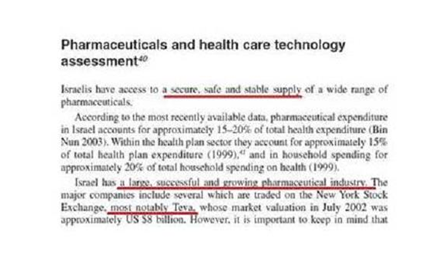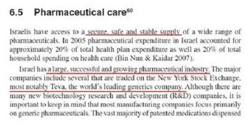 • [Η ισραηλινή φαρμακοβιομηχανία] «είναι μεγάλη, επιτυχημένη και αναπτυσσόμενη φαρμακοβιομηχανία… με πιο σημαντική την Teva… [και έχει] διασφαλισμένη, ασφαλή και σταθερή παροχή φαρμάκων… »