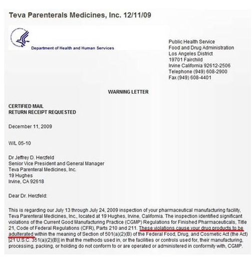 •  Την ίδια χρονιά, το 2011, η FDA έβαλε λουκέτο σε ένα εργοστάσιο του ομίλου Teva, στις ΗΠΑ.