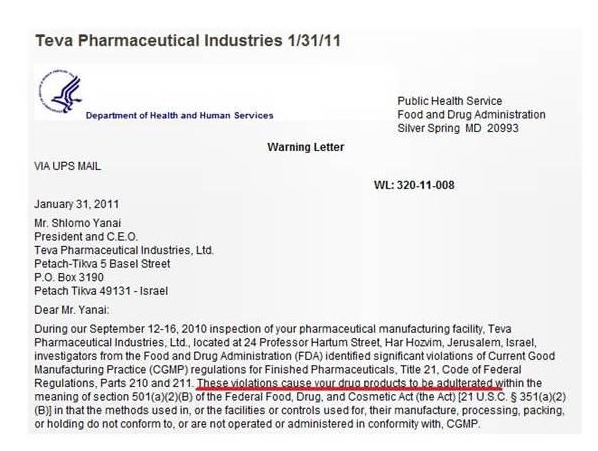 •  Επιπλέον, το 2011 η FDA εκδίδει και άλλη έκθεση-κόλαφο για την Teva, αφού οι έλεγχοι των αμερικανικών αρχών σε εργοστάσιο της εταιρείας στο Ισραήλ εντόπισαν και πάλι νοθευμένα φάρμακα, αλλά και ακαθαρσίες, μαύρα σωματίδια άγνωστης σύνθεσης, ανεπαρκείς ελέγχους, μη επιστημονικά ορθές μελέτεςακύρωση ελέγχων που είχαν αρνητικά αποτελέσματα και αντικατάστασή τους με άλλα πιο «βολικά»… Η λίστα είναι μεγάλη…