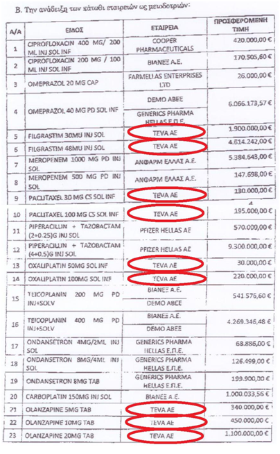Η ισραηλινή εταιρεία Teva σαρώνει στη δεύτερη ηλεκτρονική δημοπρασία, κερδίζοντας τα εννέα (9) από τα 23 σκευάσματα. Μια εταιρεία που προβάλλονταν ως «πρότυπο» στις μελέτες του κ. Μόσιαλου αλλά καταγγέλλονταν από την Αμερικανική «Διεύθυνση Τροφίμων και Φαρμάκων  (FDA).