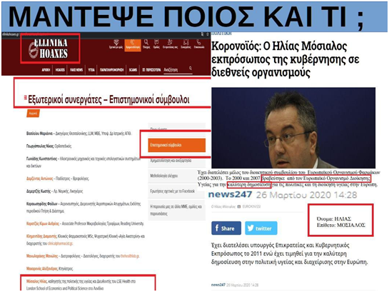 Συνεχίζοντας την έρευνα, εντοπίσαμε ότι ο κ. Ηλίας Μόσιαλος –που προωθούσε τα φάρμακα της Ισραηλινής φαρμακοβιομηχανίας Teva– είναι εξωτερικός συνεργάτης των Ellinika Hoaxes, του «εθνικού λογοκριτή» που διορίστηκε και χρηματοδοτείται κυρίως από τον Zuckerberg  (Facebook, Instagram), για να χαρακτηρίζει ως «ψευδή/fake) κάθε αποκάλυψη που δεν είναι σύμφωνη με την κυρίαρχη προπαγάνδα για τον κορωνοϊό  ή αντιδρά στην επιβολή του μαζικού εμβολιασμού του πληθυσμού της Ελλάδας. Πρόκειται για ένα λογοκριτικό εργαλείο με το οποίο έχω ασχοληθεί στο παρελθόν με δύο άρθρα.