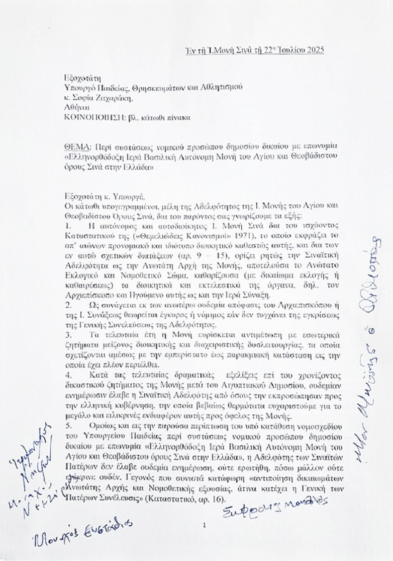 Εν τω μεταξύ, ως κεραυνός εν αιθρία έπεσε αργά χθες βράδυ στο Υπ. Παιδείας η επιστολή που απεστάλη προς την Υπουργό Παιδείας Σοφία Ζαχαράκη από την Σιναϊτική Αδελφότητα με αφορμή το νέο ίδρυμα που ιδρύεται με πρωτοβουλία του Υπ. Παιδείας με τον διακριτικό τίτλο «Ελληνορθόδοξη Ιερά Βασιλική, Αυτόνομη Μονή του Αγίου Θεοβαδίστου όρους Σινά στην Ελλάδα».