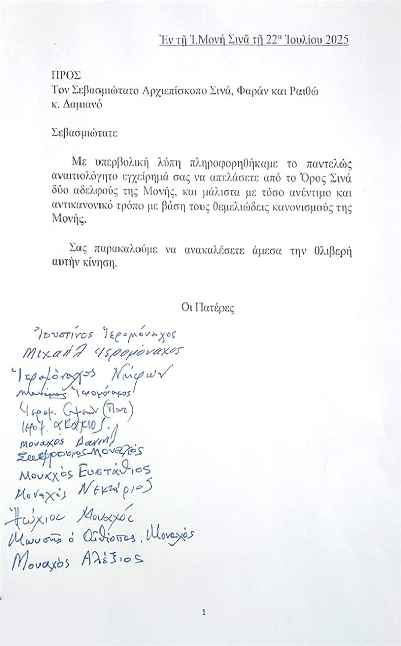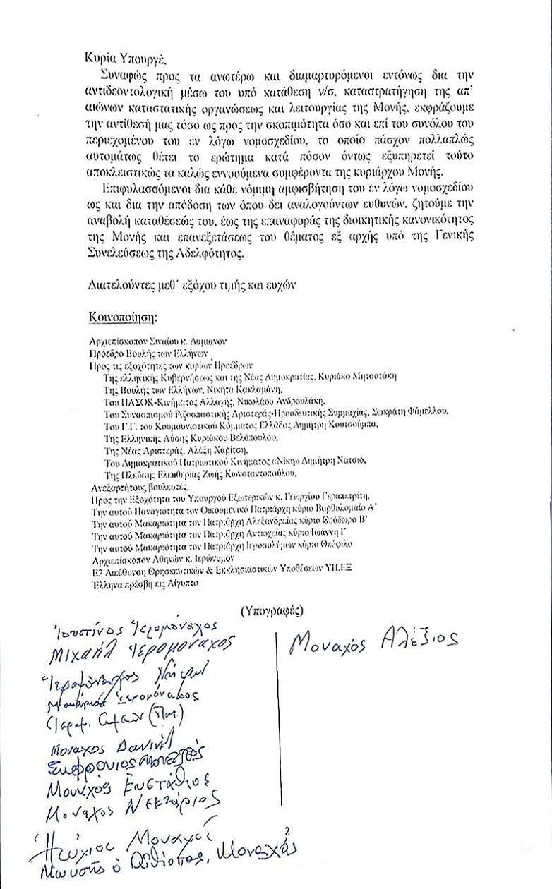 Στην επιστολή την οποία υπογράφουν οι έντεκα (συν δυο) από τους 20 εγκαταβιούντες εις την Ι.Μονή στην Αίγυπτο γίνεται σαφής η αντίρρηση στο υπό κατάρτιση νέο οργανισμό που βρισκόταν μέχρι αργά χθες βράδυ υπό διαβούλευση σχέδιο νόμου.