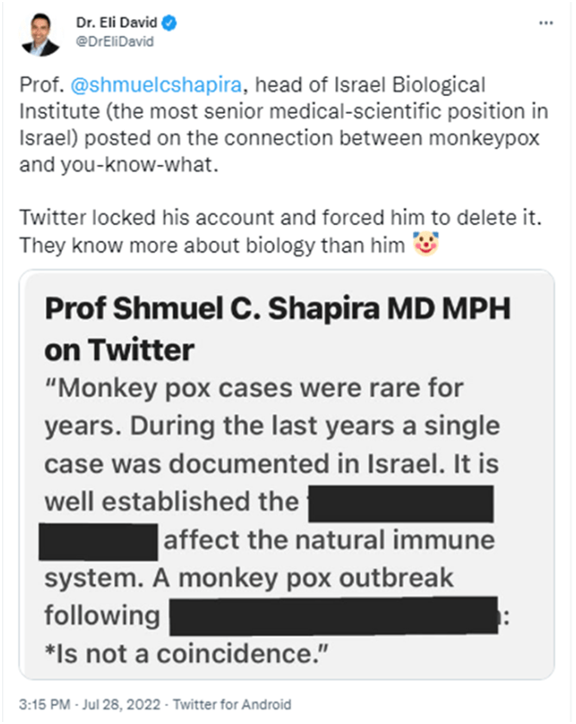 Την περασμένη εβδομάδα, το Twitter λογόκρινε τον καθηγητή Shapira (ο οποίος υπέστη σοβαρή βλάβη μετά το τρίτο του εμβόλιο Pfizer) και τον ανάγκασε να αφαιρέσει μια ανάρτηση που έλεγε: «Τα κρούσματα της ευλογιάς των πιθήκων ήταν σπάνια επί χρόνια. Τα τελευταία χρόνια καταγράφηκε μία περίπτωση στο Ισραήλ. Τώρα, είναι καλά τεκμηριωμένο ότι τα εμβόλια mRNA επηρεάζουν το φυσικό ανοσοποιητικό σύστημα. Ένα ξέσπασμα ευλογιάς των πιθήκων μετά από μαζικό εμβολιασμό για τον Covid δεν είναι τυχαίο».