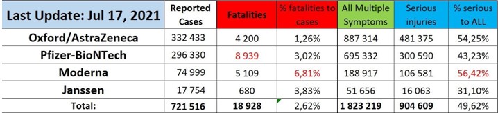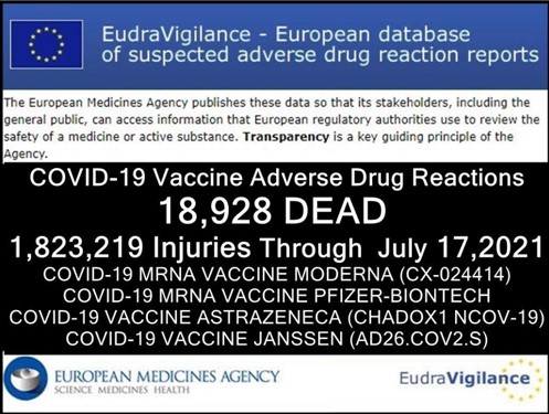 5. Η βάση δεδομένων EudraVigilance δημοσιοποίησε ότι έως τις 17 Ιουλίου 2021 αναφέρθηκαν 18.928 θάνατοι και 1.823.219 παρενέργειες από τα 4 πειραματικά «εμβόλια» για την COVID-19: Moderna • Pfizer • AstraZeneca • J&J