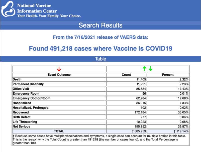 Τα δεδομένα του συστήματος VAERS που κυκλοφόρησαν στις 23 Ιουλίου 2021 από τα CDC δείχνουν ότι αναφέρθηκαν συνολικά 491.218 παρενέργειες από όλες τις ηλικιακές ομάδες μετά από «εμβόλια» COVID, στις οποίες συμπεριλαμβάνονται 11.405 θάνατοι και 48.385 σοβαρές βλάβες, μεταξύ 14 Δεκεμβρίου 2020 και 16 Ιουλίου 2021.