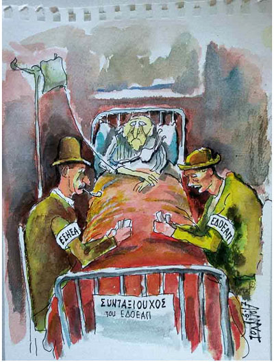 Σε χυδαίο -έγχρωμο μάλιστα- σκίτσο του, ο εξαιρετικός κατά τ΄ άλλα σκιτσογράφος Γιάννης Ιωάννου, εργαζόμενος στην συνεταιριστική -υποτίθεται- εφημερίδα και μοίρασε μέσω διαδικτύου, απεικονίζει την ΕΣΗΕΑ και τον ΕΔΟΕΑΠ να παίζουν πόκερ στο κρεβάτι του πόνου ενός ετοιμοθάνατου ασφαλισμένου του ΕΔΟΕΑΠ.