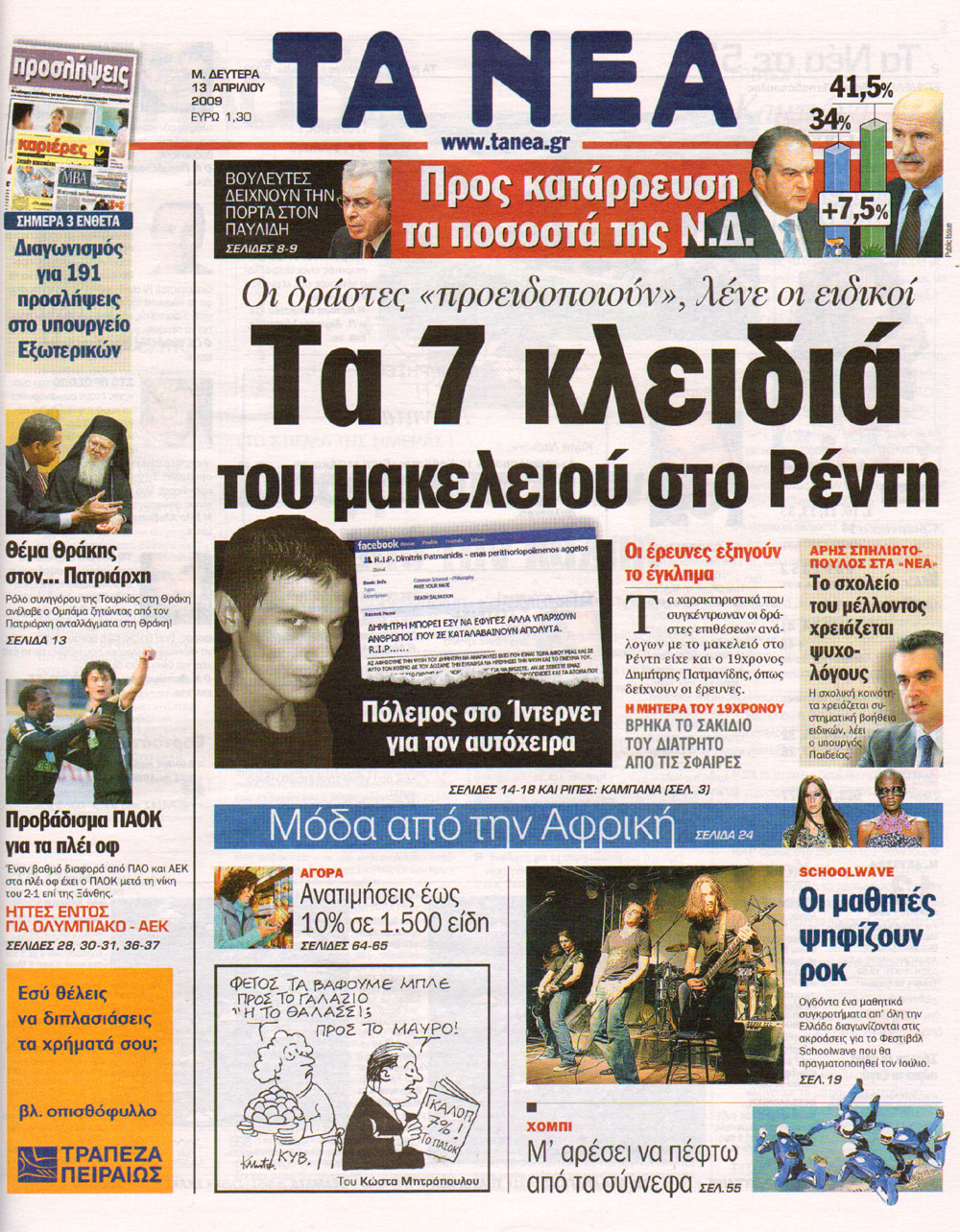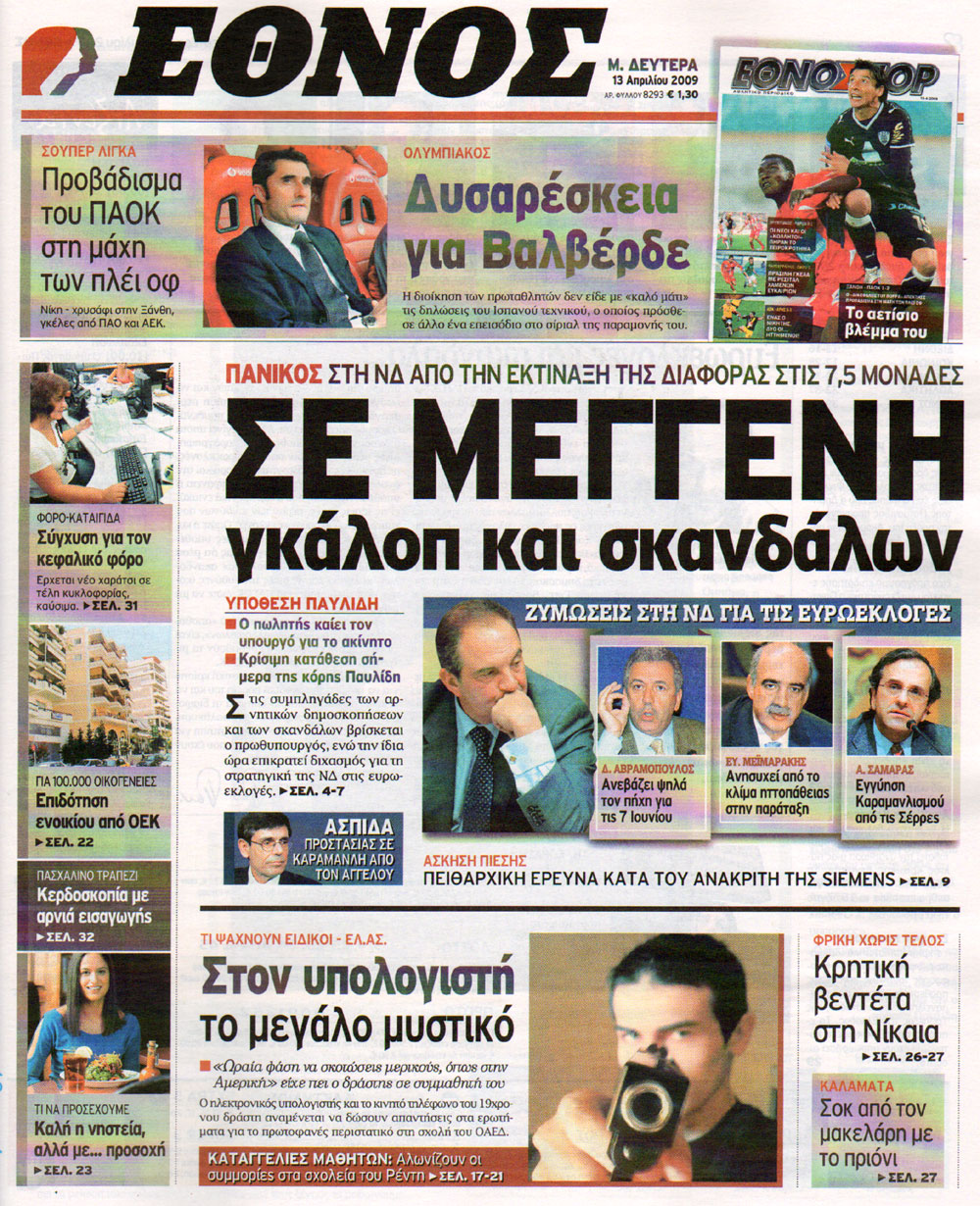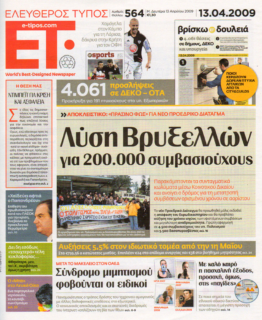 Την Κυριακή 12 Απριλίου 2009, πρώτη στην προτίμηση του αναγνωστικού κοινού, στην Αθήνα και τον Πειραιά, ήρθε η εφημερίδα Κυριακάτικη Ελευθεροτυπία. Δεύτερη ήταν η Καθημερινή, ακολουθεί...