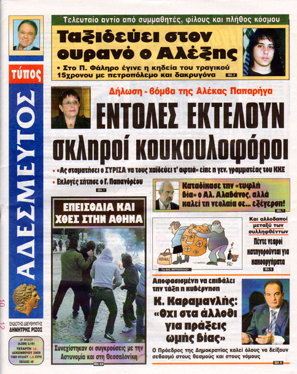 Ντρέπομαι και ζητώ συγνώμη από τον Αλέξανδρο που του αφαίρεσα τη ζωή, που όπλισα το χέρι του δολοφόνου, που πάτησα τη σκανδάλη του όπλου του εκτελεστή. Ντρέπομαι και ζητώ συγγνώμη από την...