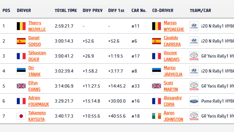 Η γενική κατάταξη δεν άλλαξε, με τον Neuville της Hyundai να παραμένει πρώτος στο EKO Rally Acropolis κατά 52.6 δευτ. μπροστά από τον Daniel Sordo (επίσης Hyundai) και κατά 1:19.6 λεπτά από τον τρίτο Ogier (Toyota).