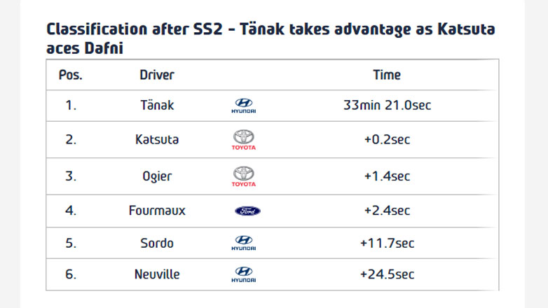 Στην 2η Ε.Δ. ο Katsuta ήταν ο ταχύτερος από όλους, όμως ο Tanak της Hyundai ήταν εξίσου ταχύτατος και έχοντας διαφορά χρόνου από την 1η Ε.Δ. πλέον ηγείται συνολικά της κούρσας, έχοντας πίσω του τον Ιάπωνα και πλέον τρίτο τον Ogier. Τα μεγαλύτερα προβλήματα συνεχίζει να αντιμετωπίζει ο Evans καθώς φαίνεται πως δεν έχει αρκετή ισχύ και αδυνατεί να είναι ανταγωνιστικός, όντας ήδη 5 λεπτά πίσω από τον πρωτοπόρο Tanak. Να αναφέρουμε πως σε αυτή την ειδική και λόγω της κόκκινης σημαίας στην 1η, οι οδηγοί εκκινούσαν