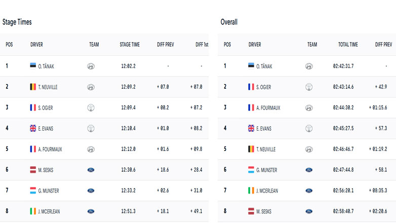 Όσον αφορά την γενική κατάταξη, ο Tanak με το Hyundai i20N, προηγείται με διαφορά 42.δευτ. από τον δεύτερο Ogier (Toyota), ενώ τρίτος είναι ο Fourmaux με πάνω από 1 λεπτό απόσταση (Hyundai i20N).