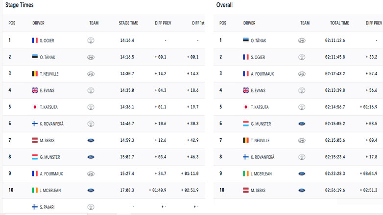 Όσον αφορά τη γενική κατάταξη, ο Tanak είναι πρώτος, με +33.2δευτ. από τον δεύτερο Ogier. Ο περσινός νικητής Neuville είναι σχεδόν εκτός μάχης, καθώς από χθες έχει 4 κλαταρίσματα… ενώ ο Rovanpera δεν έχει καταφέρει να βρει ρυθμό.