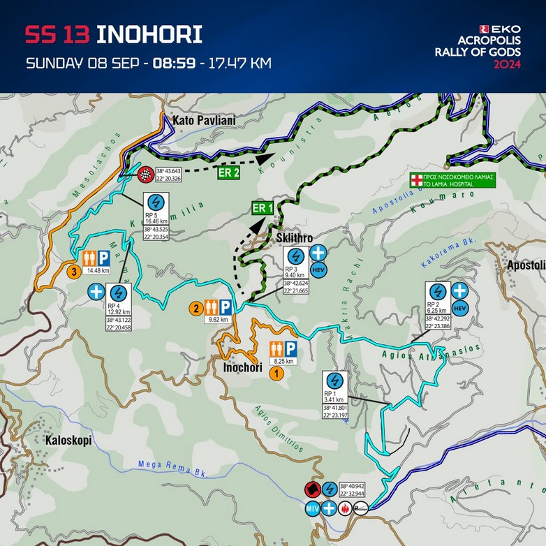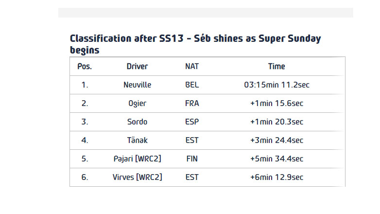 Στην πρώτη από τις 3 σημερινές και τελευταίες Ε.Δ. ο Ogier έσπασε τα χρονόμετρα και τερμάτισε με εντυπωσιακό χρόνο 14:00.6. Ένας χρόνος αρκετός για να τον ανεβάσει στην 2η θέση της γενικής κατάταξης, πάνω από τον Sordo και πίσω από τον Neuville. Δεύτερος ταχύτερος στο Οινοχώρι ο Neuville με 14:05.9 και τρίτος ο Tanak με 14:11.1 ο οποίος μάλιστα αντιμετώπισε και πρόβλημα με τον κινητήρα.