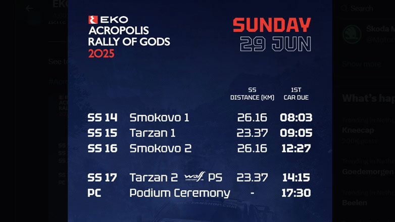 Αρχικά να αναφέρουμε πως στην προηγούμενη Ε.Δ. (Ταρζάν 1), στην κατηγορία Rally2, ο M.Bulacia είχε έξοδο με το Toyota, στο 11.3 χλμ. Ο οδηγός είναι καλά στην υγεία του, ο συνοδηγός αισθάνθηκε ενοχλήσεις στον αυχένα και ζητήθηκε ιατρική βοήθεια. Η ειδική διακόπηκε, τα πληρώματα επέστρεψαν στο σέρβις μέσω εναλλακτικής διαδρομής. Φυσικά τα περάσματα της κατηγορίας Rally1 είχαν τερματίσει, οπότε δεν επηρεάστηκαν οι χρόνοι τους.