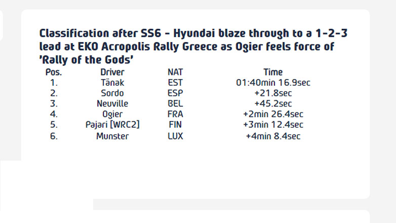 Πλέον, και με τις 6 Ε.Δ. της ημέρας να έχουν ολοκληρωθεί, την κούρσα οδηγεί ο Tanak, ακολουθούμενος από τους Sordo και Neuville.