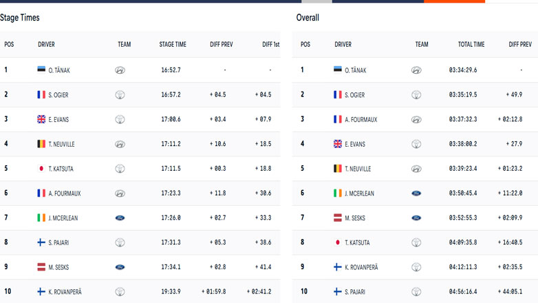 Στην γενική κατάταξη δεν άλλαξε το παραμικρό, με τον Tanak να ηγείται έχοντας απόσταση 49.9δευτ. από τον δεύτερο Ogier και 3 λεπτά από τον τρίτο Fourmaux.