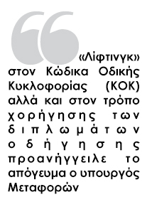 Σε ό,τι αφορά τον ΚΟΚ, εντός τριών μηνών αναμένεται να τεθεί σε διαβούλευση η πρόταση του υπουργείου Μεταφορών.