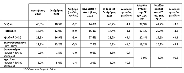 Το τελευταίο μήνα του 2022 τα αυτοκίνητα με κινητήρες βενζίνης έφθασαν το 40.3% ενώ το 2021 ήταν 40.5% (μείωση -0.2%).