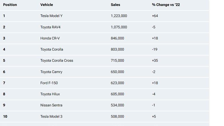 Οι συνολικές πωλήσεις του Model Y ανήλθαν σε 1.223.000, σύμφωνα με τα στοιχεία της Jato, με αποτέλεσμα να προηγείται του πρωταθλητή του 2022 RAV4 της Toyota (1,075 εκατομμύρια), του τρίτου Honda CR-V (846.000), του τέταρτου Toyota Corolla (803.000) και του Toyota Corolla Cross (715.000), το οποίο κατέλαβε την πέμπτη θέση.