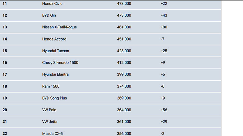 Η Toyota κατέλαβε πέντε θέσεις στην πρώτη 25άδα, περισσότερες από κάθε άλλη αυτοκινητοβιομηχανία, ενώ η κινεζική BYD κατέλαβε τρεις θέσεις.