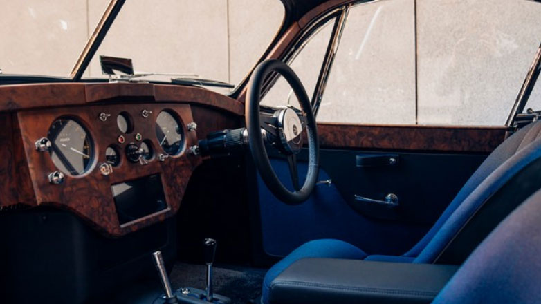 Στο εσωτερικό, η μαγευτική εικόνα είναι μία σύνθεση από ανακυκλώσιμα υλικά και από σκουπίδια που περισύλλεξε η εταιρία από τον ωκεανό. Δίχτυα ψαρέματος, πλαστικά μπουκάλια, σπασμένα ξύλα κ.α., έγιναν η βάση πάνω στην οποία χτίστηκε η καμπίνα του αυτοκινήτου, η οποία κρατάει την παλιά αύρα, διαθέτει όμως σύγχρονες ευκολίες. Από την μία οι επενδύσεις θυμίζουν το ’50, από την άλλη η ψηφιακή οθόνη αφής (με συνδεσιμότητα Apple CarPlay) δίνει το άγγιγμα του σήμερα, τόσο όσο να μην χαλάσει το ταξίδι στο χρόνο.