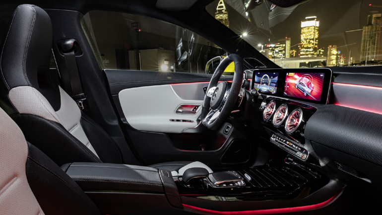Στο εσωτερικό δεν υπάρχουν εκπλήξεις, με το flat bottom τιμόνι, τα σπορ καθίσματα με την υπογραφή της AMG, τα κόκκινα διακοσμητικά και το σύστημα πολυμέσων MBUX με τις μεγάλες οθόνες να βρίσκονται στον βασικό εξοπλισμό. Όποιος επιθυμεί μπορεί να προσθέσει το AMG Track Pace, το οποίο καταγράφει δεδομένα σε πίστα ή σε διαδρομή που επιλέγει ο οδηγός. Φυσικά δεν λείπει το AMG Drive Select με τα πέντε προγράμματα λειτουργίας (Slippery, Comfort, Sport, Sport+ και Individual).
