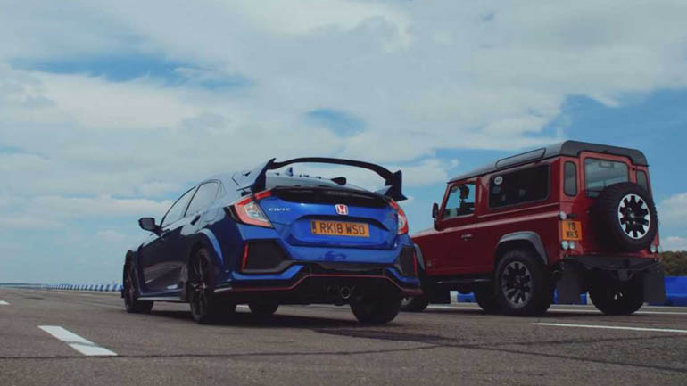 Το βρετανικό περιοδικό Top Gear πήρε το Defender Works V8 και το έβαλε να αναμετρηθεί στην ευθεία με το κορυφαίο προσθιοκίνητο της αγοράς, το Honda Civic Type R. Το τελευταίο τροφοδοτείται από τον δίλιτρο VTEC turbo κινητήρα των 320 ίππων και 400 Nm ροπής.