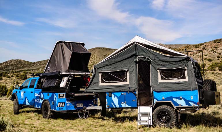 Τις συναρπαστικές δυνατότητες του Ultimate Parks TITAN συμπληρώνει το ρυμουλκούμενο τρέιλερ Black Series Camper με τη συρόμενη πλατφόρμα, τις ράγες φόρτωσης και το αντίσκηνο τύπου CVT.
