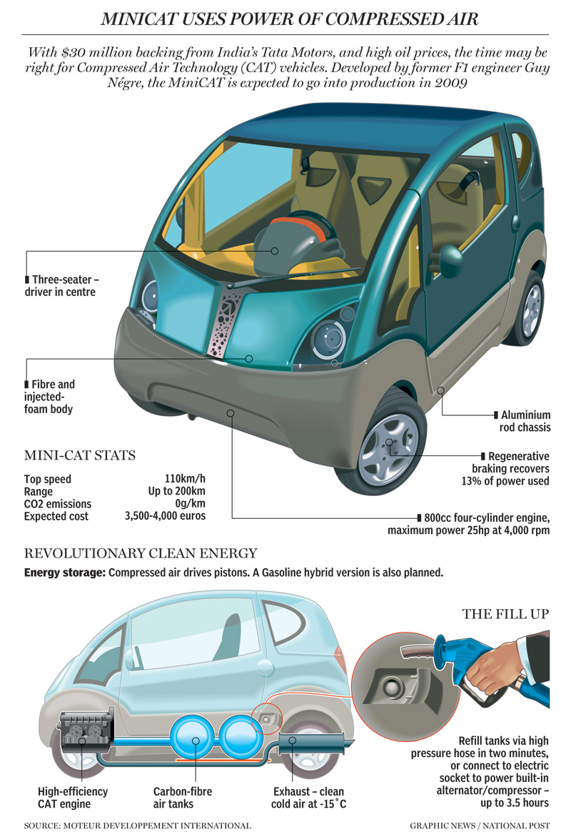 Η Tata ανακοίνωσε ότι εξέλιξε περαιτέρω την τεχνολογία MDΙ και τα επόμενα χρόνια θα λανσάρει ένα αυτοκίνητο που κινείται με αέρα, έχοντας μεγαλύτερη αυτονομία και ικανοποιητικές επιδόσεις. Το εν λόγω μοντέλο θα βγει κανονικά στην παραγωγή, θα κοστίζει λίγο πάνω από 5.000 ευρώ και θα γεμίζει με αέρα σε περίπου 120 δευτερόλεπτα. Απίστευτο κι όμως αληθινό!
