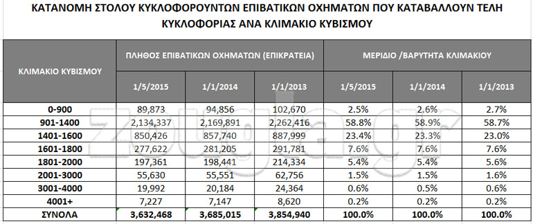 Πάνω από 800.000 ιδιοκτήτες ΔΕΝ πληρώνουν τέλη ενώ κυκλοφορούν τα αυτοκίνητά τους…με την Ελληνική Στατιστικής Υπηρεσία, κυκλοφορούν στην Ελλάδα λίγο πάνω από τα πέντε εκατομμύρια αυτοκίνητα και από αυτά “πληρώνουν” τέλη τα 3.63 εκατομμύρια. Τα 560.000 είναι σε προσωρινή ακινησία, τα 50.000 έχουν μηδενικά τέλη, άρα με απλά μαθηματικά οι ιδιοκτήτες των 840.000 περίπου ΔΕΝ πληρώνουν τέλη κυκλοφορίας! Αυτά θα μπορούσαμε να πούμε πως είναι και τα ΙΣΟΔΥΝΑΜΑ.. Τόσο απλά. Οι πονηροί και οι υπεράνω του νόμου θα πρέπει κάποτε να πληρώσουν. ΌΧΙ πάλι αυτοί που πληρώνουν χωρίς να φωνάζουν ή τηρούν το γράμμα του νόμου.