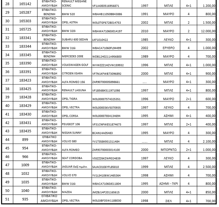 Όπως θα δείτε στη σχετική λίστα, οι τιμές ξεκινούν από τα 300 ευρώ και φτάνουν για πιο σύγχρονα αυτοκίνητα τα 17.000, όπως συμβαίνει για παράδειγμα με μία BMW που εφοδιάζεται με κινητήρα diesel. Τα συγκεκριμένα αυτοκίνητα προέρχονται από κατασχέσεις ή ήταν παρατημένα και προορίζονται για κυκλοφορία.