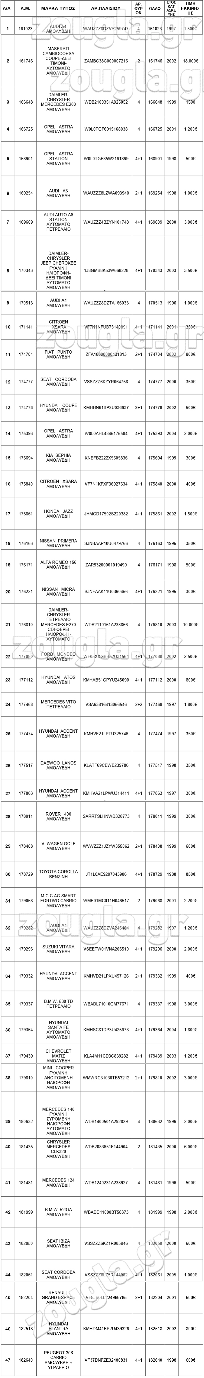 Για παράδειγμα, θα υπάρχει προς πώληση Nissan Micra, Rover 400 αλλά και Hyundai Accent με 300 ευρώ. Επίσης στη σχετική λίστα μπορεί κανείς να δει ακόμα και Peugeot 306 cabrio εφοδιασμένο με σύστημα υγραεριοκίνησης σε τιμή 600 ευρώ, Mercedes E με 500 ευρώ, Suzuki Vitara με 2.000 ευρώ κ.ο.κ.