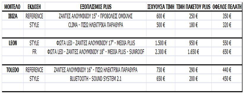 Η διάθεση των εκδόσεων Seat “Plus” προσφέρουν το κάτι παραπάνω στον υποψήφιο πελάτη που πλέον έχει στην διάθεσή του εκδόσεις με υπερπλήρη βασικό εξοπλισμό. Στον παρακάτω πίνακα μπορείτε να δείτε τις προτάσεις της εταιρείας αλλά και τις τιμές των πακέτων.