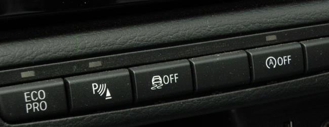 Από αριστερά: Κουμπί για να αλλάζει η χαρτογράφηση και να προσφέρεται χαμηλότερη κατανάλωση. Αισθητήρας παρκαρίσματος. Σύστημα πρόσφυσης και κουμπί ενεργοποίησης του συστήματος που σβήνει και ενεργοποιεί τον κινητήρα όταν το αυτοκίνητο είναι σταματημένο…