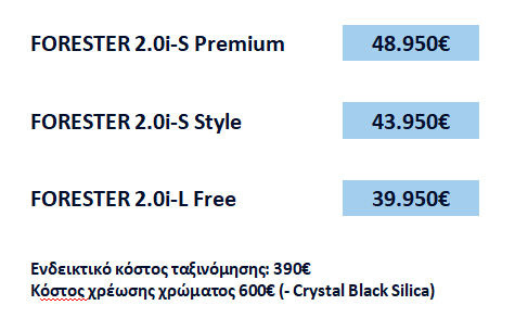 Το μήκους 4,625 μέτρων Subaru Forester είναι διαθέσιμο σε τρεις εκδόσεις με τις τιμές να ξεκινούν από τα 39.950 και να φτάνουν έως τα 48.950 ευρώ.