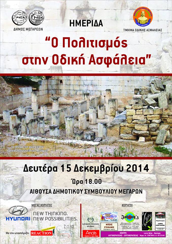 Μία πολύ ενδιαφέρουσα ημερίδα που αφορά όλους συνδιοργανώνουν ο Δήμος Μεγάρων μαζί με την εθελοντική ομάδα Μεγάρων Κούρος. Η ημερίδα με τίτλο «Ο Πολιτισμός στην οδική ασφάλεια» είναι προγραμματισμένη για την Δευτέρα 15 Δεκεμβρίου 2014 στην αίθουσα του Δημοτικού συμβουλίου και ώρα 18.00.