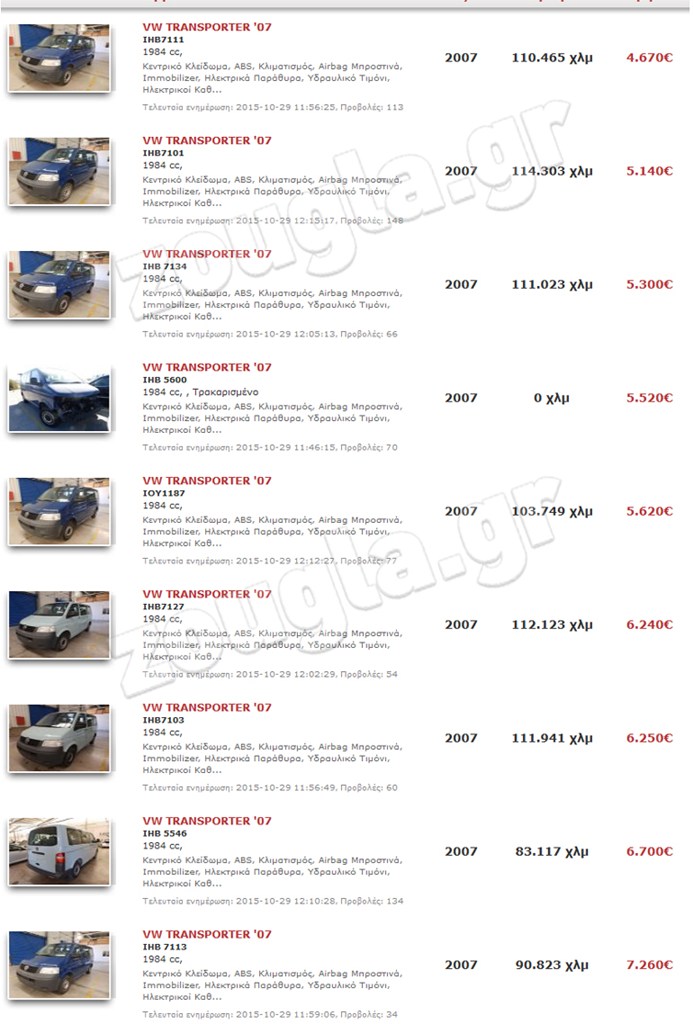 Όπως μπορείτε να δείτε και από τις φωτογραφίες ή τη σχετική λίστα που δημοσιεύει το zougla.gr πρόκειται για οχήματα χρονολογίας 2007 με τα διανυθέντα χιλιόμετρα να ξεκινούν από τα 83.117 και να φτάνουν τα 114.303.
