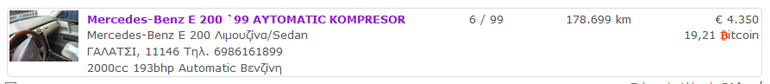 Ήδη στο διαδίκτυο και σε σελίδες που έχουν προς πώληση μεταχειρισμένα αυτοκίνητα έχουν κάνει την εμφάνισή τους τα λεγόμενα…bitcoin. Όπως θα δείτε και παρακάτω, από αγγελίες που βρήκαμε, η αγοροπωλησία μπορεί να γίνει τόσο σε ευρώ όσο και σε… bitcoin.